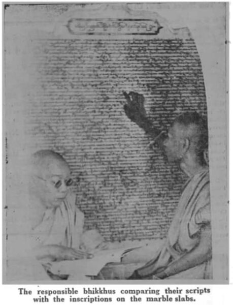 Monks comparing reading on stelae (Sangāyanā Monthly Bulletin 1.1, 1953, 11)