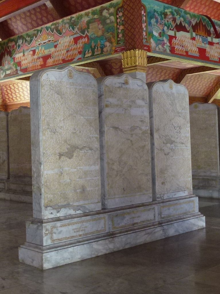 Unlike previous royally commissioned copies of the Pali canon, which were handwritten on palm leaves, this recension was also inscribed on stone. Spread over 5.2 hectares, the 729 marble stelae are arranged in seven concentric squares around the site’s central gilded pagoda. Each stela varies in size, though a typical one is approximately 1.3 metres high, a metre wide, has around 75 lines of inscribed text on each side and is housed in a separate open-sided mini-pagoda around 3 metres in height.