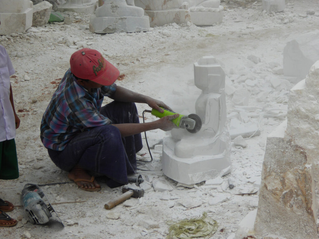 The grey-white streaked marble used for the stelae was sourced from Sagyin Mountain, located over 30 kilometres north of the Kuthodaw Pagoda. Once the marble had been extracted from the quarry, it was reportedly transported to Mandalay via boats travelling down the Irrawaddy River. Sagyin Mountain may be visited today and is still an active marble quarry with artisan workshops producing religious statues. Each marble stela has been set within a mini-pagoda with metal-barred window openings on three sides and a metal-grille door on the fourth. Since bodily relics are traditionally interred in pagodas, the placement of the stelae within mini-pagodas highlights the sacred status of the inscribed text, while also providing some protection from the elements. The 729 marble stelae have been arranged in seven concentric squares grouped into three sections, representing the three piṭakas, or ‘baskets’, of the Pali canon. Each stela is numbered and if one were to visit each sequentially, s/he would walk in a clockwise direction around the central pagoda, which is the traditional way to circumambulate a pagoda.